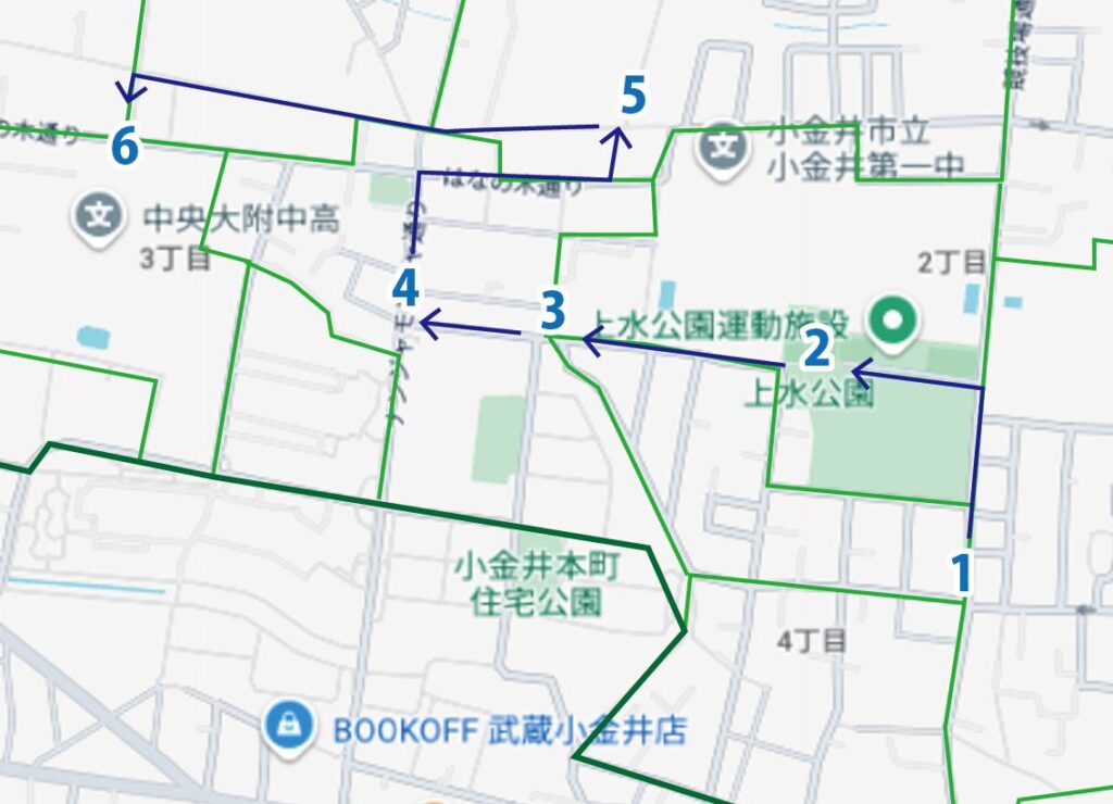 1~5の順路で点検しています。各順路における「危険ポイント」「危険と思われる理由」「危険回避のための対応や対策を市や警察に依頼した内容」「小金井市警察署・小金井市役所からの回答」は以下の通りです。