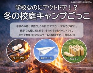 PTA主催のイベントを実施する委員です。これまで、遠足の見守り活動、給食の試食会を開催、3月には「冬のキャンプごっこ」を開催します。